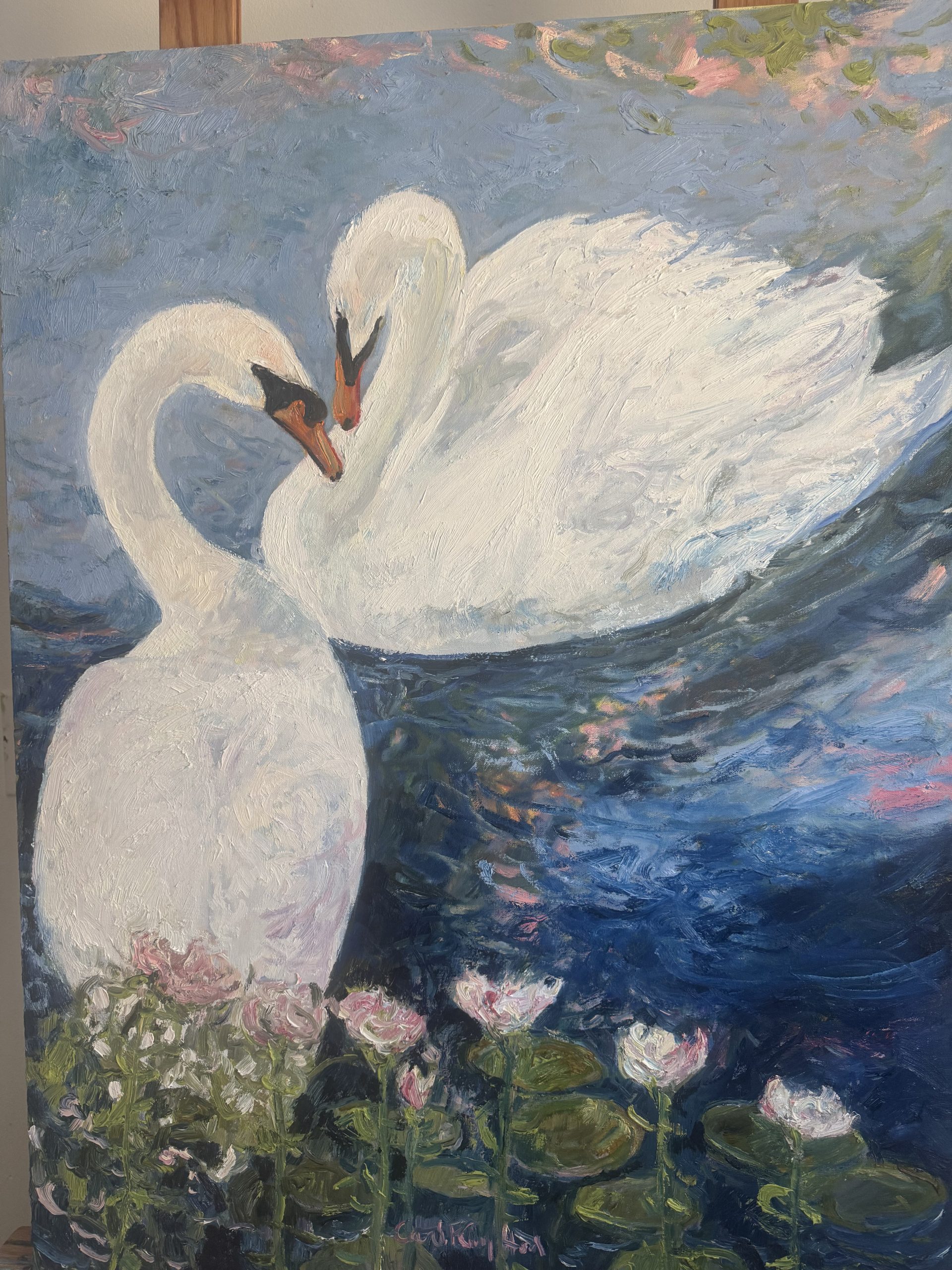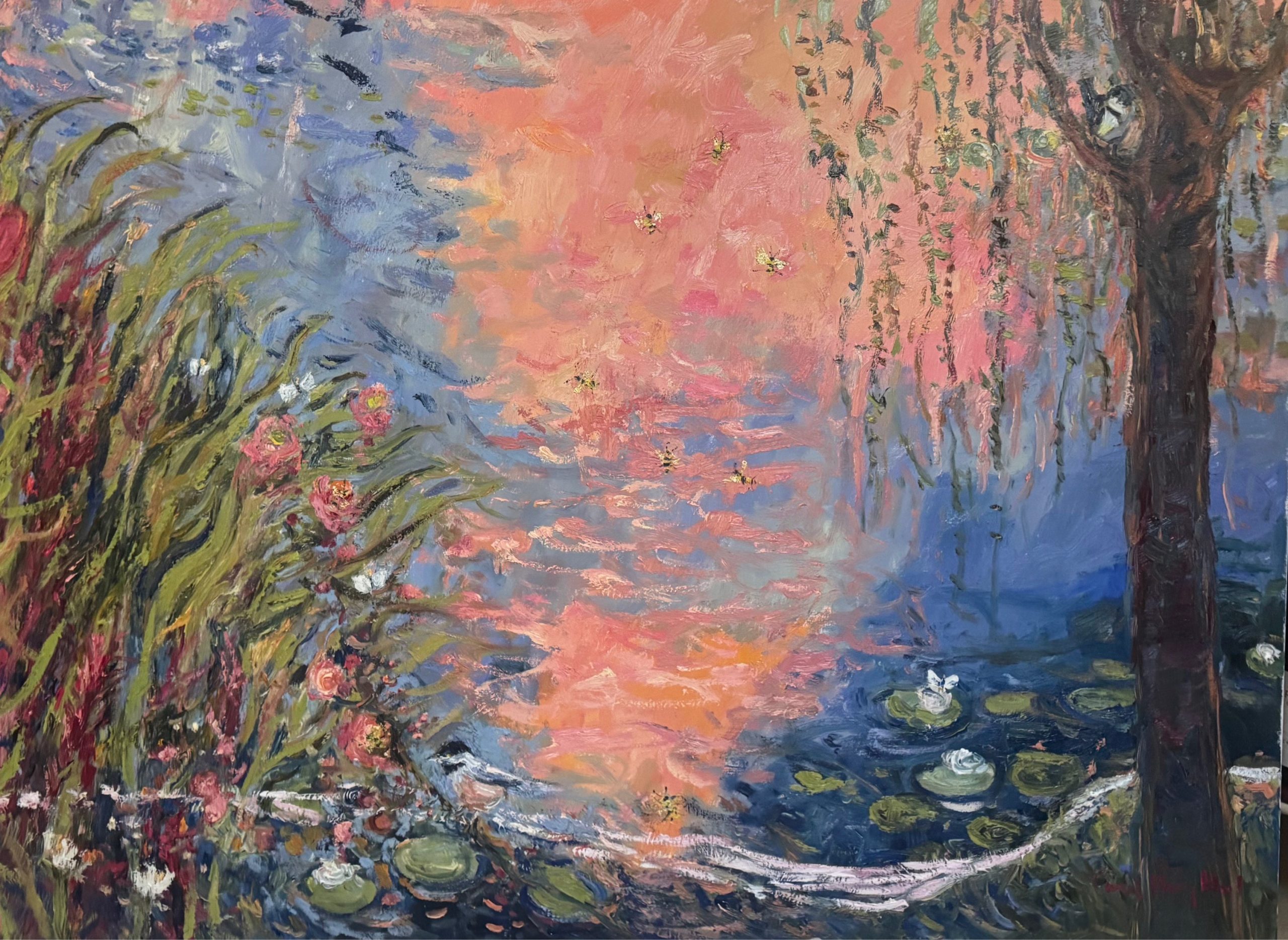 In Lilly Lake Carol has found the same qualities that fascinated Monet in his gardens at Giverny but also finds qualities uniquely South Jersey, migrating monarch butterflies, swans and our special light. Carol continuously finds new ideas with the way the lake changes with the seasons, the migrations, the different clouds of the big shore sky. Thinking of Monet as he stepped out of his house and into his garden at Giverny, thinking of the