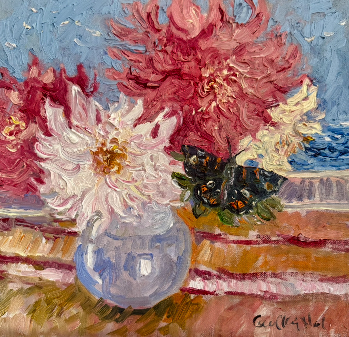 In Lilly Lake Carol has found the same qualities that fascinated Monet in his gardens at Giverny but also finds qualities uniquely South Jersey, migrating monarch butterflies, swans and our special light. Carol continuously finds new ideas with the way the lake changes with the seasons, the migrations, the different clouds of the big shore sky. Thinking of Monet as he stepped out of his house and into his garden at Giverny, thinking of the