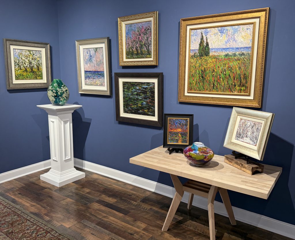 Samir Sammoun uses the texture of his specially gessoed linen canvas to allow the oil to create a sense of drama. His paintings are meant to be viewed from a distance. However, once viewing the work one may find themselves drawn closer to appreciate the deep richness of color and drama created with the swirling movement of the brush. While clearly inspired by Monet and Van Gogh, Samir brings his own distinctive take on French Impressionism to Cape May.