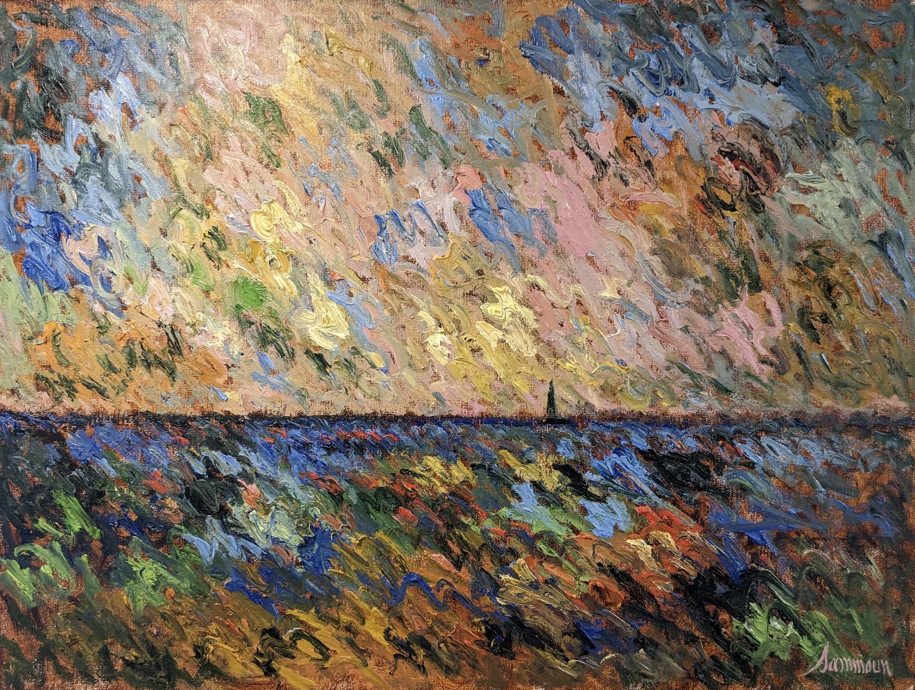 Samir Sammoun uses the texture of his specially gessoed linen canvas to allow the oil to create a sense of drama. His paintings are meant to be viewed from a distance. However, once viewing the work one may find themselves drawn closer to appreciate the deep richness of color and drama created with the swirling movement of the brush. While clearly inspired by Monet and Van Gogh, Samir brings his own distinctive take on French Impressionism to Cape May.
